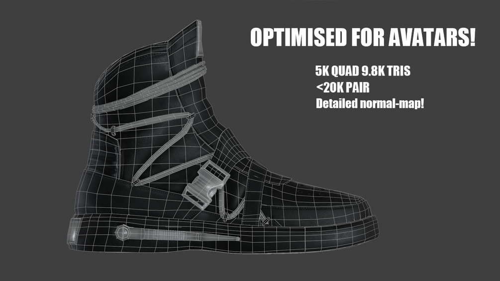 I have included alternative colors for more stylish looks! These shoes are perfect for tech-wear outfits. They are modeled from scratch and textured in Substance Painter for realistic PBR materials!
